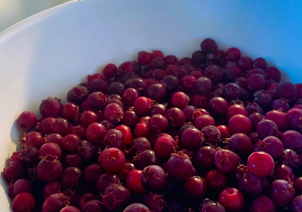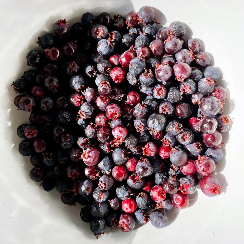 I got home from work, and my husband had foraged my favorite native tree fruit in June. Also known as the shadbush, shadwood or shadblow, serviceberry or sarvisberry (or just sarvis), juneberry, saskatoon, sugarplum, wild-plum or chuckley pear, the genus of Amelanchier (/æməˈlænʃɪər/ am-ə-LAN-sheer) consists of about 20 species of deciduous-leaved shrubs and small trees in the rose family (Rosaceae). It’s an all season beauty with its cute oval leaves and multi-stem structure. I do ask of anyone who does pick these delightful gifts, to leave some for our pollinators and for our elder community.